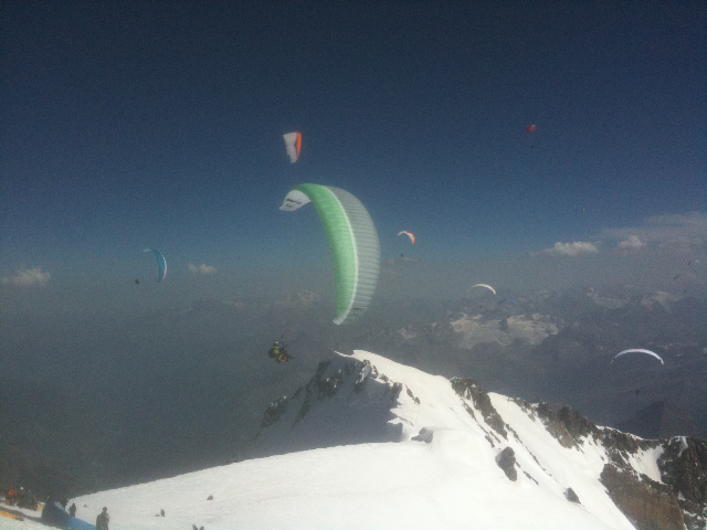 After soaring the thermals like a bird, from Brevent resort with a atke off at 2000m: Franck reached the summit in a record breaking 1hour30minutes!! Arriving above Mont Blanc at 5300m, he landed on the summit and was joined later by a small group of the best pilots in the world who had the same dream.